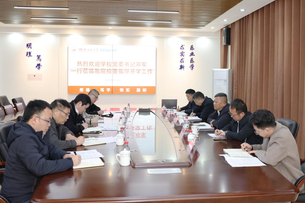 根据学校2024年春季学期开学有关工作安排,3月7日下午,学校党委书记邓军在党办(校办)主任张成龙、本科生院院长康志强、党委组织部副部长邓炼、本科生院杨硕老师等陪同下到我院进行新学期开学工作检查。学院党政领导班子成员参加了座谈。