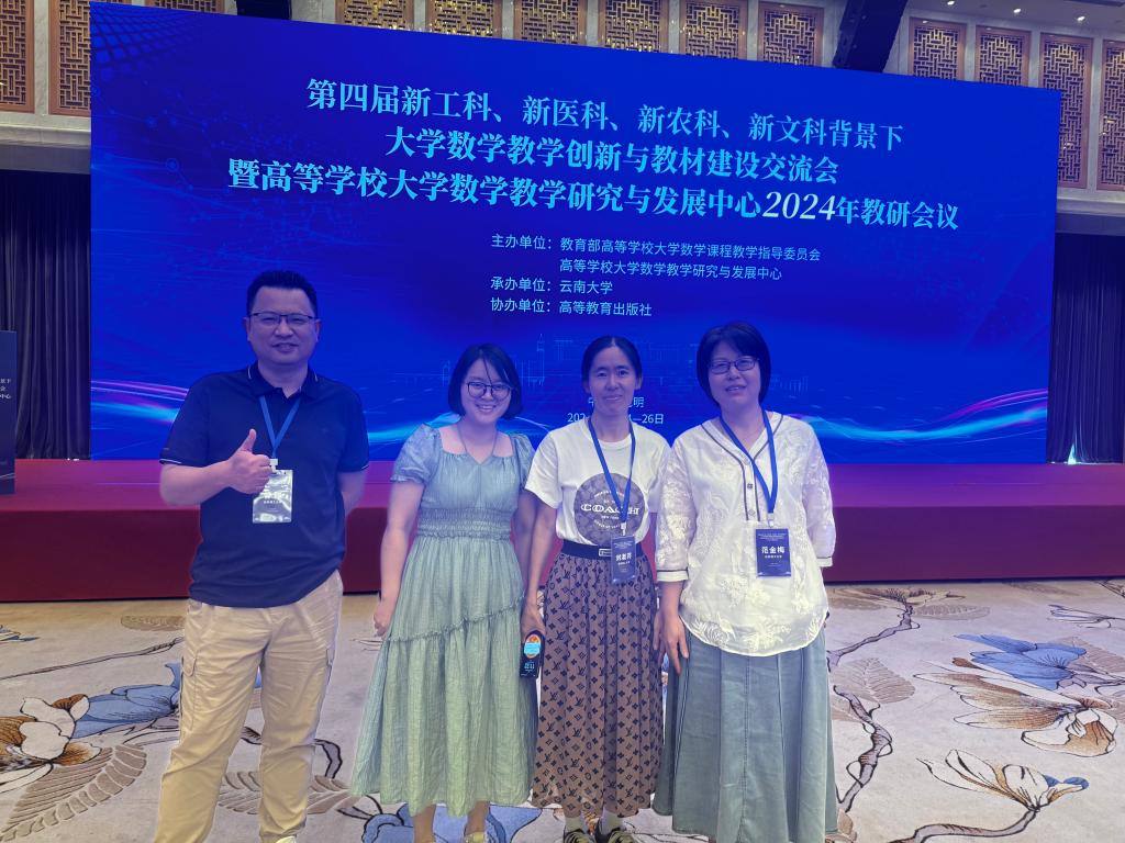 2024年5月24日,基础数学课程团队曾翔、刘淑芹、范金梅、刘海花一行4人赶赴云南昆明参加“第四届新工科、新医科、新农科、新文科背景下大学数学教学创新与教材建设研讨会暨高等学校大学数学教学研究与发展中心2024年教研年会”。