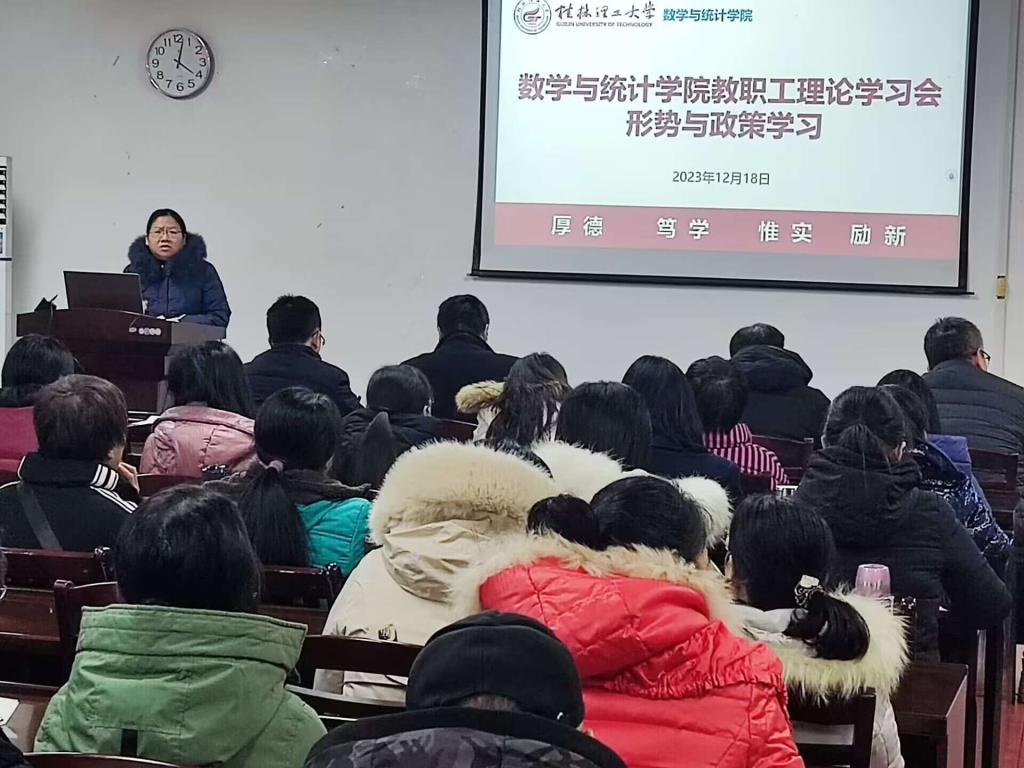 12月18日,学院在雁山校区7122会议室召开教职工理论学习会,专题学习形势与政策相关文件,深入学习习近平总书记关于宣传思想工作的重要思想和全国宣传思想文化工作会议精神、习近平总书记在中共中央政治局第九次集体学习时的重要讲话精神以及习近平总书记重要理论文章《推进生态文明建设需要处理好几个重大关系》。学院党委书记江玲主讲,学院全体教职工参加了会议。