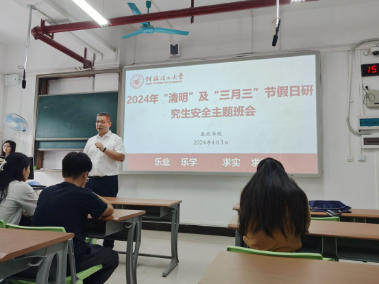 为更好的提升研究生的安全意识,并加强研究生的安全管理,数统学院于2024年4月3日在雁山1901教室召开了研究生“清明节”及“壮族三月三”节假日安全教育主题班会。此次会议分2023级、2022级和2021级两个场次进行。会议由数统学院研究生辅导员主持,学院党委副书记钟立军出席。