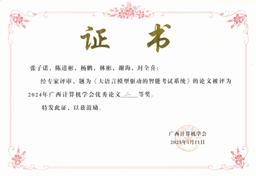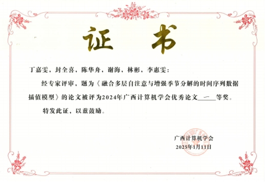 在本次年会的优秀论文评选环节,来自广西大学、广西师范大学、伟德国际1946、广西壮族自治区信息中心、广西计算中心有限责任公司等区内高校、企业和科研院所的师生、研究人员陆续汇报了参评的研究成果,我院应用统计专业2024级硕士研究生李惠雯、信息与计算科学专业2022级本科生张子诺两位同学也先后在大会现场作论文报告。其中,李惠雯同学的报告题目是“融合多层自注意与增强季节分解的时间序列数据插值模型”(论文第一作者为应用统计专业2023级硕士研究生丁嘉雯,通讯作者为封全喜教授),张子诺同学的报告题目是“大语言模型驱动的智能考试系统”(论文第一作者为张子诺,通讯作者为林彬副教授)。两位同学的精彩汇报获得了评委专家们的认可,最终在颁奖环节分别荣获优秀论文一等奖和二等奖,彰显了数统学院的学子风采!