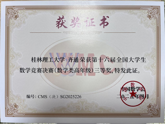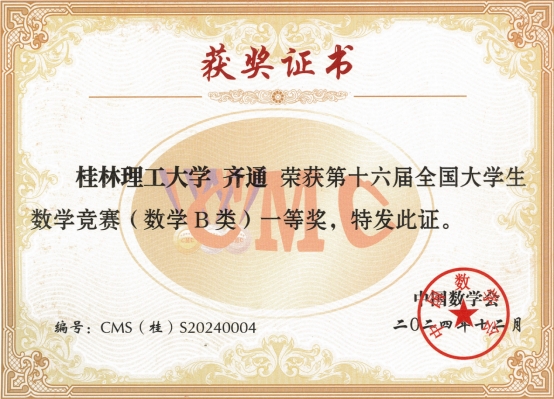 在本届竞赛中,我校信息与计算科学专业2022级学生齐通,在初赛里获得广西赛区数学类高年级组一等奖第一名,成功入围决赛,并在决赛中荣获全国三等奖(广西第二名)。初赛时,我校信息与计算科学专业学生成绩优异,4人获广西赛区一等奖(数学专业类),2人获二等奖,4人获三等奖,创下我校数学类学生参赛最好成绩,实现新突破。此外,在初赛非数学专业类比赛中,我校有9人获一等奖、21人获二等奖、17人获三等奖,成绩同样出色。