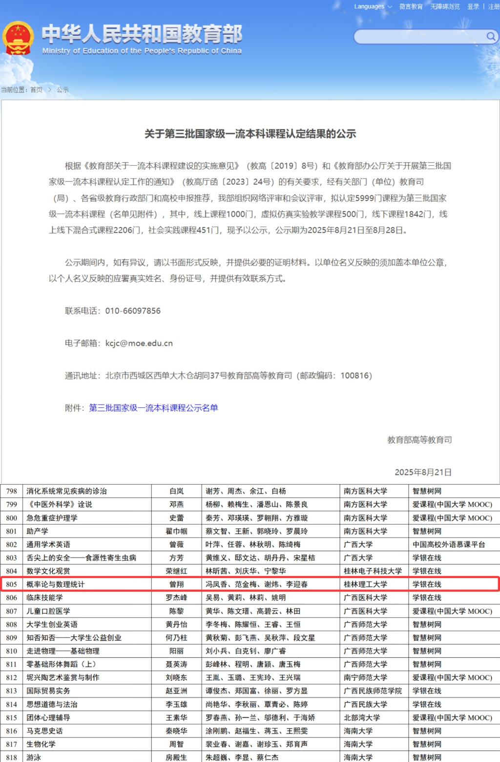 8月21日,教育部高等教育司公布《关于第三批国家级一流本科课程认定结果的公示》,伟德betvlctor1946源于英国课程《概率论与数理统计》成功入选“国家级线上一流本科课程”,标志着学院课程建设进一步实现突破。