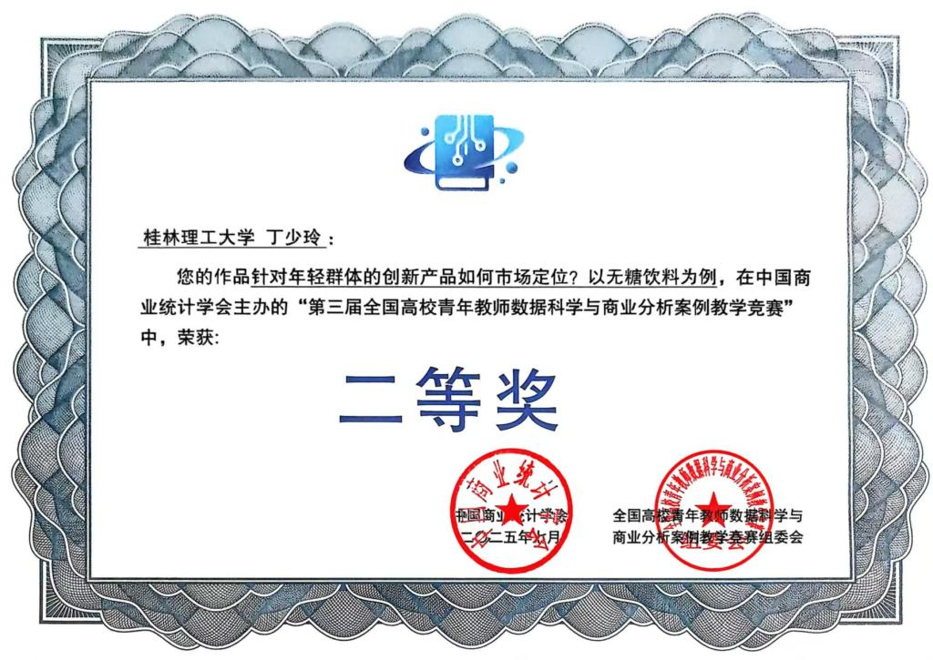 在第三届全国高校青年教师数据科学与商业分析案例教学竞赛中,丁少玲老师的案例教学竞赛作品“年轻群体的创新产品如何市场定位?以无糖饮料为例”荣获全国二等奖。在第五届全国数学建模微课程(案例)教学竞赛中,罗梦卓老师的微课程教学竞赛作品“汽车主动悬架系统优化”荣获全国二等奖。在教育部高等教育司公布的《关于第三批国家级一流本科课程认定结果的公示》结果中,曾翔老师团队负责的《概率论与数理统计》成功入选“国家级线上一流本科课程”,丁少玲老师团队负责的《应用多元统计分析》获评区级一流线下课程。更为振奋人心的是,学院统计学专业在“2025软科中国最好学科排名”中位列全国第31位,稳居全国前40%行列。这一成绩的取得,是对学院长期以来坚持“以本为本”、推进教育教学改革的有力肯定。