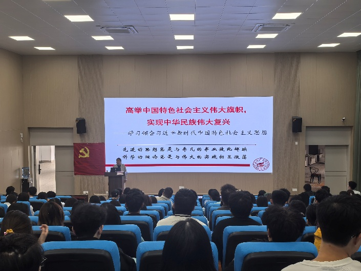 江玲书记以《高举中国特色社会主义伟大旗帜,实现中华民族伟大复兴——学习领会习近平新时代中国特色社会主义思想》为主题,围绕“中国特色社会主义进入新时代”“当今世界经历新变局”“中华民族伟大复兴面临新考验”“科学社会主义焕发新生机”四个维度,系统阐释了习近平新时代中国特色社会主义思想形成的时代背景、历史逻辑与实践基础。她强调,先进的思想与非凡的事业相互辉映,科学的理论与伟大的实践彼此激荡,新时代党员发展对象要深刻理解党的创新理论,增强“四个意识”,坚定“四个自信”,做到“两个维护”。